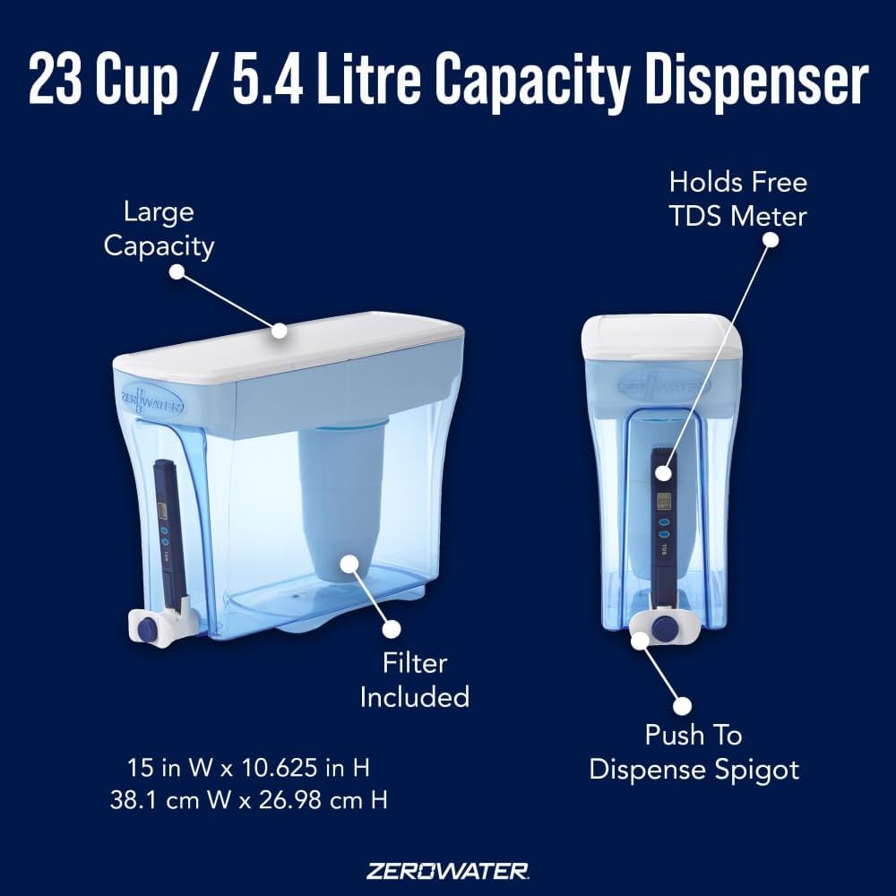 موزع تنقية المياه ZeroWater® سعة 23 كوب مثالي للاستخدام المنزلي أو في المكاتب الصغيرة. تصميمه الأنيق مزوّد بصنبور ضغطة وصبّ بيد واحدة، يتيح لك تعبئة كوبك أو قنينة المياه المفضلة لديك بسهولة من دون رفع الموزع. نظام الترشيح المكوّن من 5 مراحل يزيل 99.6% من جميع المواد الصلبة الذائبة من مياه الصنبور، ويحوّلها إلى مياه شرب لذيذة وخالية من الـTDS.